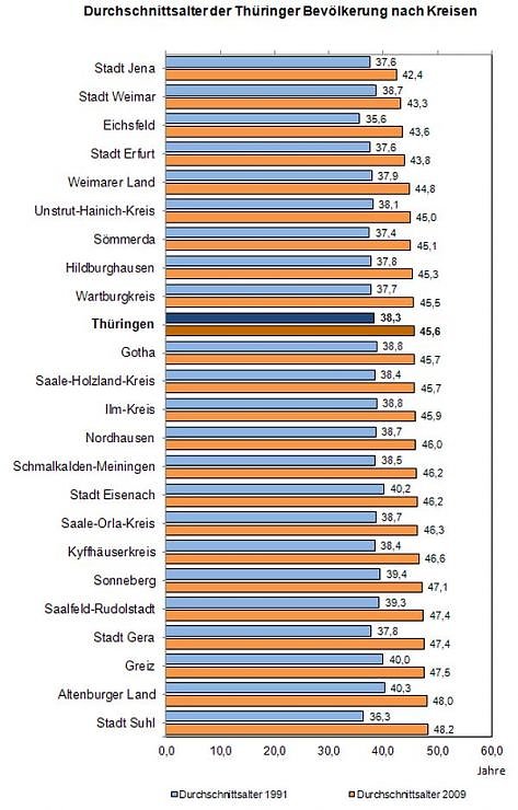 Seit Ende 1991, d.h. in 18 Jahren, ist das Durchschnittsalter der Thüringer Bevölkerung um 7,3 Jahre gestiegen, das der Männer um 7,8 und das der Frauen um genau 7,0 Jahre. Dieser Prozess verlief in den (Kreis-)Regionen des Landes mehr oder weniger schnell. Am geringsten stieg das Durchschnittsalter in Weimar (+ 4,5 Jahre) und Jena (+ 4,9 Jahre) an.