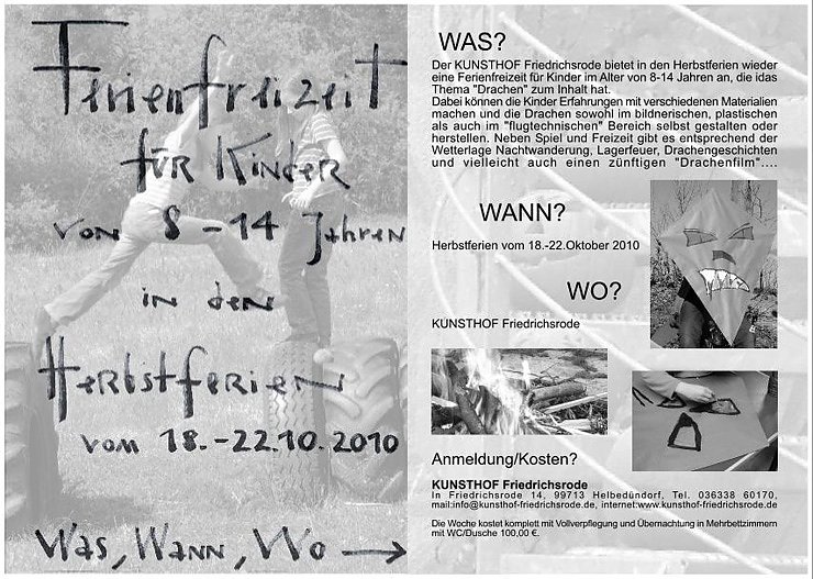Wann findet es statt? Natürlich in den Herbstferien vom 18.-22.Oktober 2010. Und wo? Natürlich im KUNSTHOF Friedrichsrode in Friedrichsrode 14, 99713 Helbedündorf, Tel. 036338 60170, mail:info@kunsthof-friedrichsrode.de, internet:www.kunsthof-friedrichsrode.de
