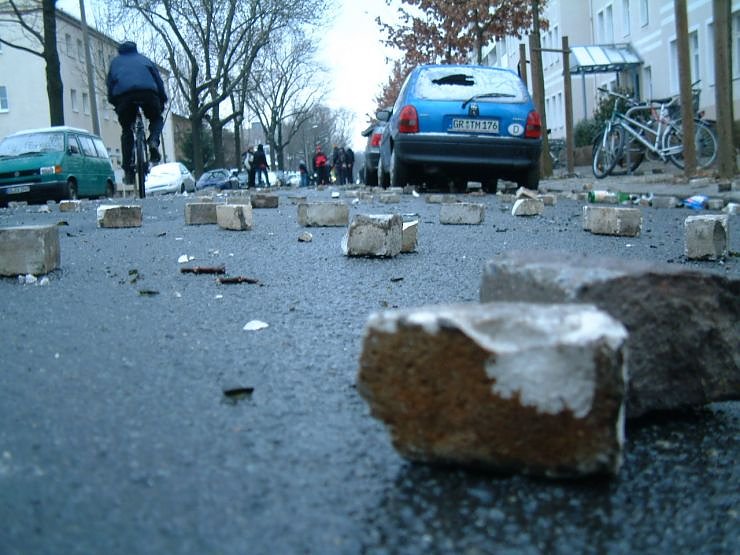 So richtig dicht ist die Blockade nicht. Einzelne Einheiten der Polizei gelangen unbehelligt durch die Blockierenden zu den Barrikaden im Osten oder ihren eigenen Verbänden im Westen. Plötzlich kommt Bewegung in die Sache. Aus Richtung Reichenbachstraße ist eine größere Menschenmenge auf dem Weg zum Blockadepunkt. Die Polizei reagiert schnell und kann verhindern dass die Gruppe die Blockade verstärkt. Einzelne Grüppchen versuchen über den nahe gelegenen Sportplatz zu gelangen, scheitern jedoch zumeist.